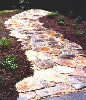 Often flagstone walkways meander through the yard. Beautiful flower gardens on either side of the flagstone walkway add contrast to the rock texture.